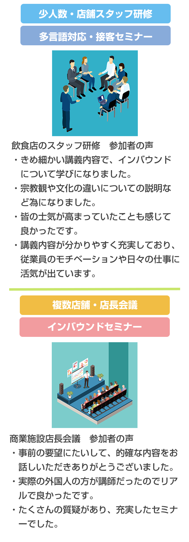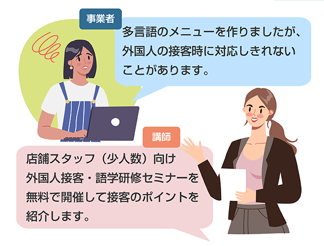 - ●外国人接客のプロ:多言語研修、接客研修実施や、外国の文化、習慣を詳しく説明します。