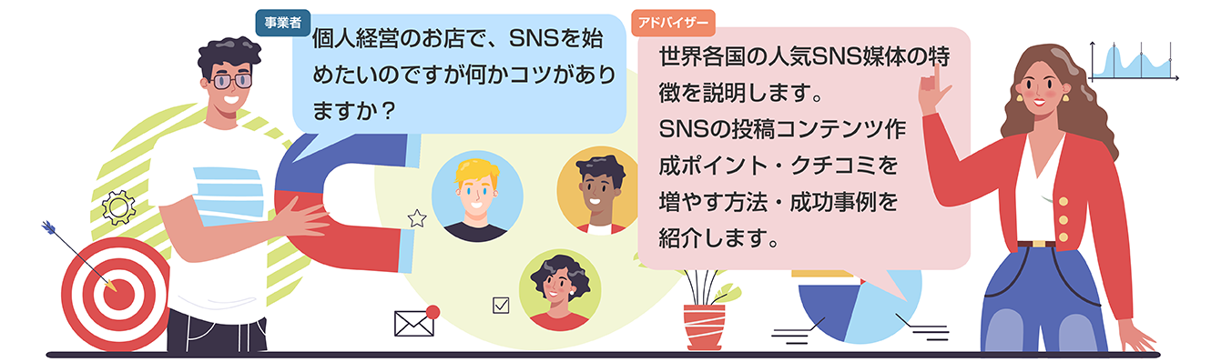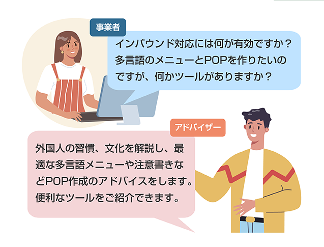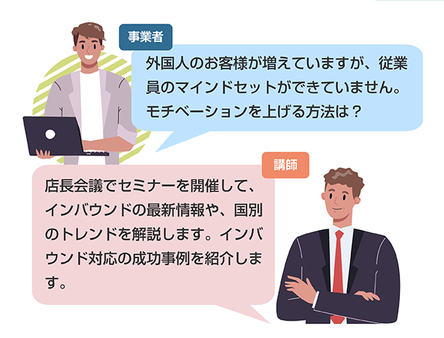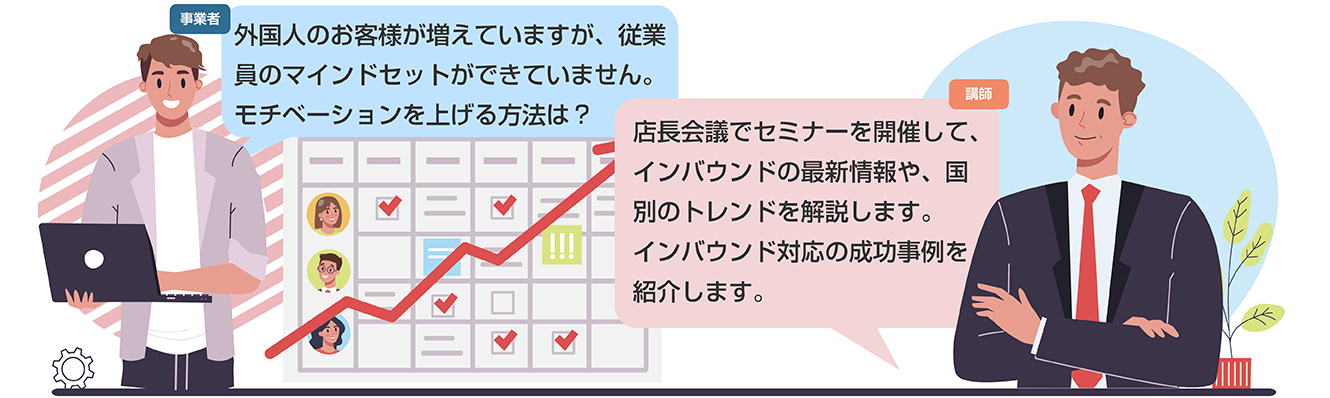 インバウンド最新情報を解説し、外国人目線でアドバイスします。 - ●宿泊業、飲食業、小売業、各業界の専門家:業種毎の課題に応じてアドバイスします。